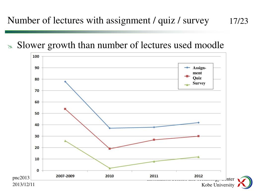 Number of lectures with assignment / quiz / survey • Slower growth than number of lectures used moodle Assign-ment Quiz Survey pnc2013