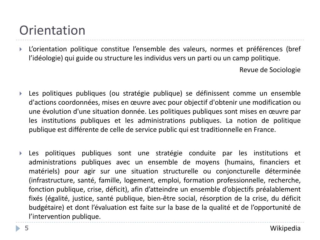 Orientation • L’orientation politique constitue l’ensemble des valeurs, normes et préférences (bref l’idéologie) qui guide ou structure les individus vers un parti ou un camp politique. Revue de Sociologie • Les politiques publiques (ou stratégie publique) se définissent comme un ensemble d'actions coordonnées, mises en œuvre avec pour objectif d'obtenir une modification ou une évolution d'une situation donnée. Les politiques publiques sont mises en œuvre par les institutions publiques et les administrations publiques. La notion de politique publique est différente de celle de service public qui est traditionnelle en France. • Les politiques publiques sont une stratégie conduite par les institutions et administrations publiques avec un ensemble de moyens (humains, financiers et matériels) pour agir sur une situation structurelle ou conjoncturelle déterminée (infrastructure, santé, famille, logement, emploi, formation professionnelle, recherche, fonction publique, crise, déficit), afin d’atteindre un ensemble d’objectifs préalablement fixés (égalité, justice, santé publique, bien-être social, résorption de la crise, du déficit budgétaire) et dont l’évaluation est faite sur la base de la qualité et de l’opportunité de l’intervention publique. Wikipedia