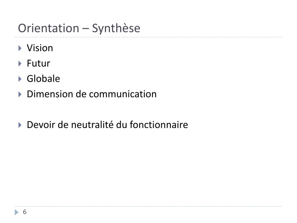 Orientation – Synthèse • Vision • Futur • Globale • Dimension de communication • Devoir de neutralité du fonctionnaire