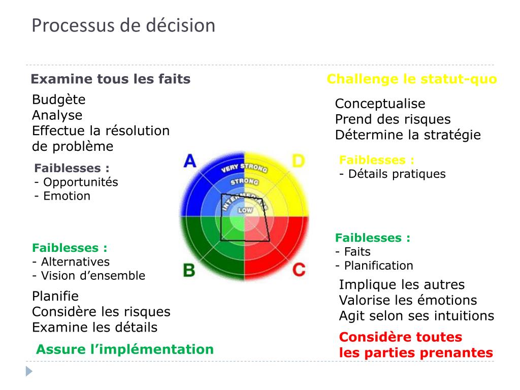 Processus de décision Examine tous les faits Challenge le statut-quo Budgète Analyse Effectue la résolution de problème Conceptualise Prend des risques Détermine la stratégie Faiblesses : - Détails pratiques Faiblesses : - Opportunités - Emotion Faiblesses : - Faits - Planification Faiblesses : - Alternatives - Vision d’ensemble Implique les autres Valorise les émotions Agit selon ses intuitions Planifie Considère les risques Examine les détails Considère toutes les parties prenantes Assure l’implémentation