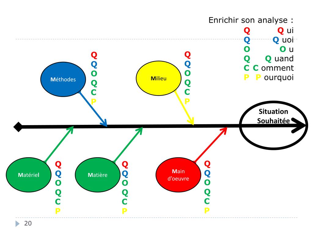 Enrichir son analyse : Q Q O Q C P Qui Quoi O u Quand Comment Pourquoi Q Q O Q C P Q Q O Q C P Milieu Méthodes Situation Souhaitée Q Q O Q C P Matériel Q Q O Q C P Matière Q Q O Q C P Main d’oeuvre