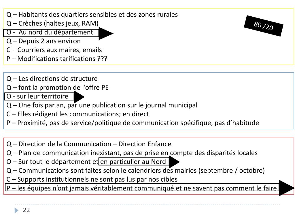 Q – Habitants des quartiers sensibles et des zones rurales Q – Crèches (haltes jeux, RAM) O - Au nord du département Q – Depuis 2 ans environ C – Courriers aux maires, emails P – Modifications tarifications ??? 80 /20 Q – Les directions de structure Q – font la promotion de l’offre PE O - sur leur territoire Q – Une fois par an, par une publication sur le journal municipal C – Elles rédigent les communications; en direct P – Proximité, pas de service/politique de communication spécifique, pas d’habitude Q – Direction de la Communication – Direction Enfance Q – Plan de communication inexistant, pas de prise en compte des disparités locales O – Sur tout le département et en particulier au Nord Q – Communications sont faites selon le calendriers des mairies (septembre / octobre) C – Supports institutionnels ne sont pas lus par nos cibles P – les équipes n’ont jamais véritablement communiqué et ne savent pas comment le faire
