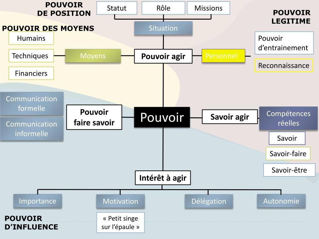 POUVOIR DE POSITION Statut Rôle Missions POUVOIR LEGITIME Situation POUVOIR DES MOYENS Humains Pouvoir d’entrainement Techniques Moyens Pouvoir agir Personnel Reconnaissance Financiers Communication formelle Pouvoir faire savoir Pouvoir Compétences réelles Savoir agir Communication informelle Savoir Savoir-faire Savoir-être Intérêt à agir Importance Autonomie Motivation Délégation POUVOIR D’INFLUENCE « Petit singe sur l’épaule »