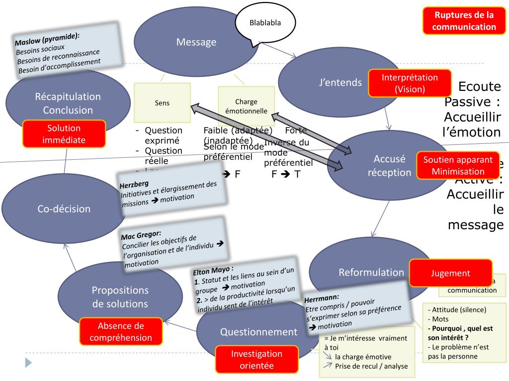 Blablabla Message Ruptures de la communication Maslow (pyramide): Besoins sociaux Besoins de reconnaissance Besoin d’accomplissement J’entends Récapitulation Conclusion Interprétation (Vision) Ecoute Passive : Accueillir l’émotion Sens Charge émotionnelle Solution immédiate • Question exprimé • Question réelle • Langage Verbal • Langage non verbal Faible (adaptée) Forte (inadaptée) Accusé réception Inverse du mode préférentiel Selon le mode préférentiel Soutien apparant Minimisation Ecoute Active : Accueillir le message Herzberg Initiatives et élargissement des missions motivation F F F T Co-décision Mac Gregor: Concilier les objectifs de l’organisation et de l’individu motivation Reformulation Elton Mayo : 1. Statut et les liens au sein d’un groupe motivation 2. > de la productivité lorsqu’un individu sent de l’intérêt Jugement Propositions de solutions Paradoxe de la communication Herrmann: Etre compris / pouvoir s’exprimer selon sa préférence motivation Questionnement - Attitude (silence) - Mots - Pourquoi , quel est son intérêt ? - Le problème n’est pas la personne Absence de compréhension = Je m’intéresse vraiment à toi la charge émotive Prise de recul / analyse Investigation orientée