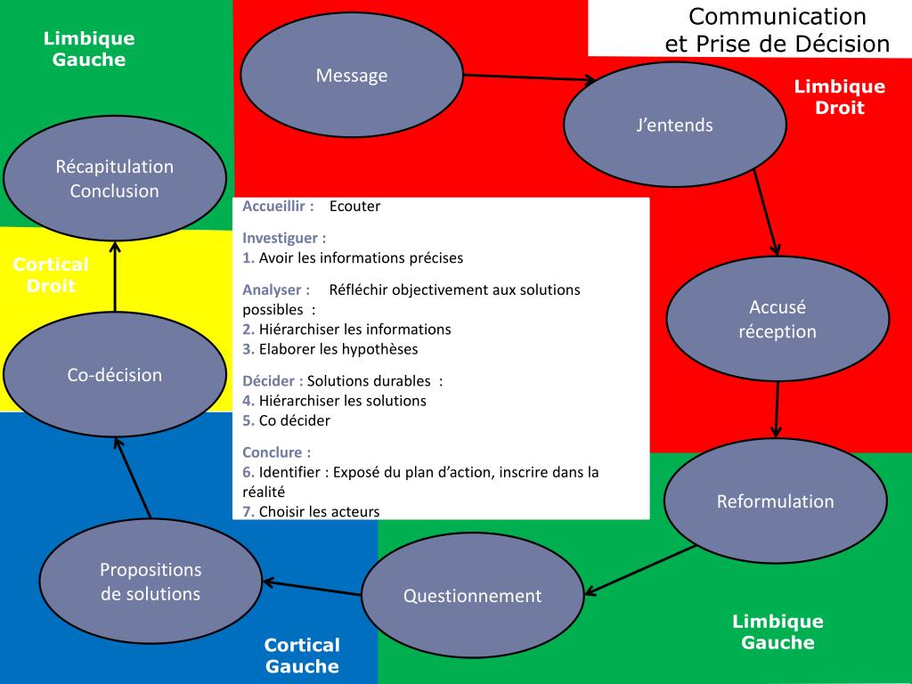 Communication et Prise de Décision Message Limbique Gauche J’entends Limbique Droit Récapitulation Conclusion Accueillir : Ecouter Investiguer : 1. Avoir les informations précises Analyser : Réfléchir objectivement aux solutions possibles : 2.Hiérarchiser les informations 3.Elaborer les hypothèses Décider : Solutions durables : 4. Hiérarchiser les solutions 5.Co décider Conclure : 6. Identifier : Exposé du plan d’action, inscrire dans la réalité 7.Choisir les acteurs Cortical Droit Accusé réception Co-décision Reformulation Propositions de solutions Questionnement Limbique Gauche Cortical Gauche