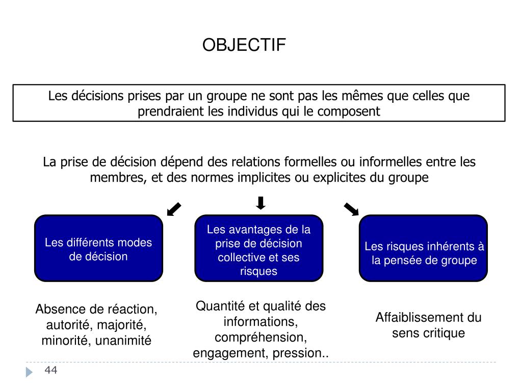OBJECTIF Les décisions prises par un groupe ne sont pas les mêmes que celles que prendraient les individus qui le composent La prise de décision dépend des relations formelles ou informelles entre les membres, et des normes implicites ou explicites du groupe Les avantages de la prise de décision collective et ses risques Les différents modes de décision Les risques inhérents à la pensée de groupe Quantité et qualité des informations, compréhension, engagement, pression.. Absence de réaction, autorité, majorité, minorité, unanimité Affaiblissement du sens critique