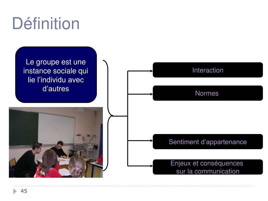Définition Le groupe est une instance sociale qui lie l’individu avec d’autres Interaction Normes Sentiment d’appartenance Enjeux et conséquences sur la communication