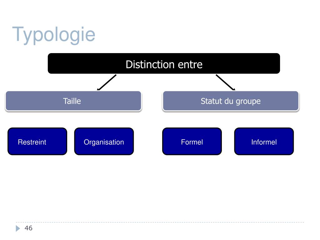 Typologie Distinction entre Taille Statut du groupe Restreint Organisation Formel Informel