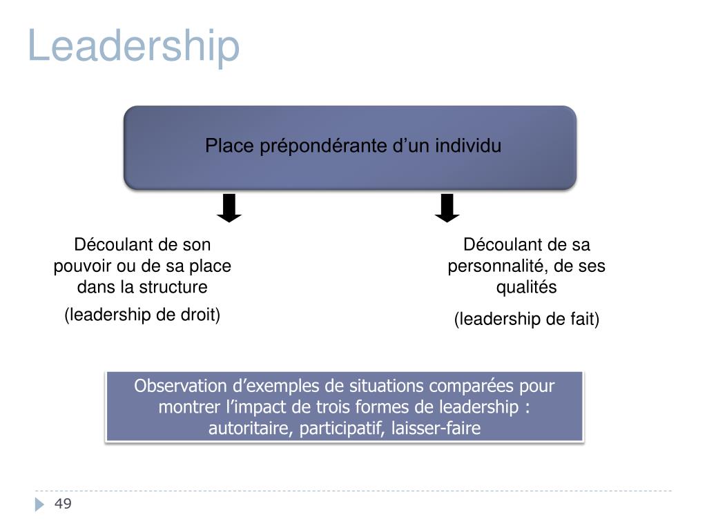 Leadership Place prépondérante d’un individu Découlant de son pouvoir ou de sa place dans la structure (leadership de droit) Découlant de sa personnalité, de ses qualités (leadership de fait) Observation d’exemples de situations comparées pour montrer l’impact de trois formes de leadership : autoritaire, participatif, laisser-faire