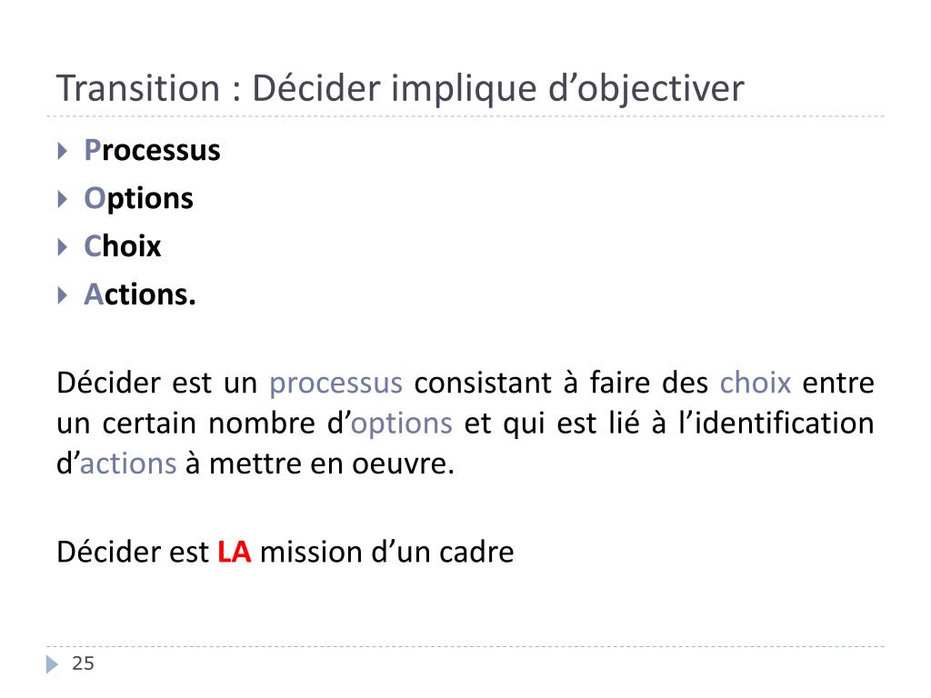 Transition : Décider implique d’objectiver • Processus • Options • Choix • Actions. Déciderest un processusconsistant à faire des choix entre un certain nombred’options et qui estlié à l’identificationd’actions à mettre en oeuvre. DéciderestLA mission d’un cadre