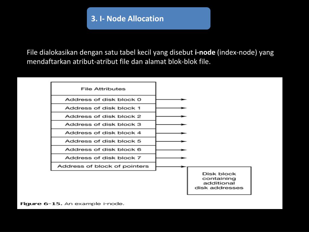 3. I- Node Allocation File dialokasikandengansatutabelkecil yang disebuti-node (index-node) yang mendaftarkanatribut-atribut file danalamatblok-blok file.