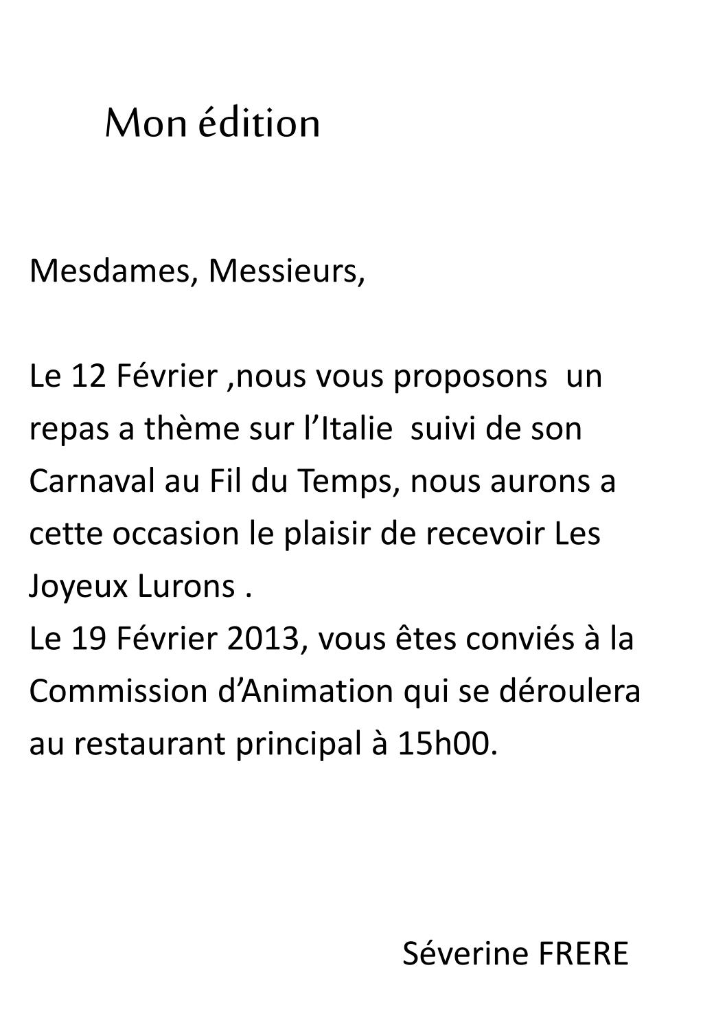 Mon édition Mesdames, Messieurs, Le 12 Février ,nous vous proposons un repas a thème sur l’Italie suivi de son Carnaval au Fil du Temps, nous aurons a cette occasion le plaisir de recevoir Les Joyeux Lurons . Le 19 Février 2013, vous êtes conviés à la Commission d’Animation qui se déroulera au restaurant principal à 15h00. Séverine FRERE