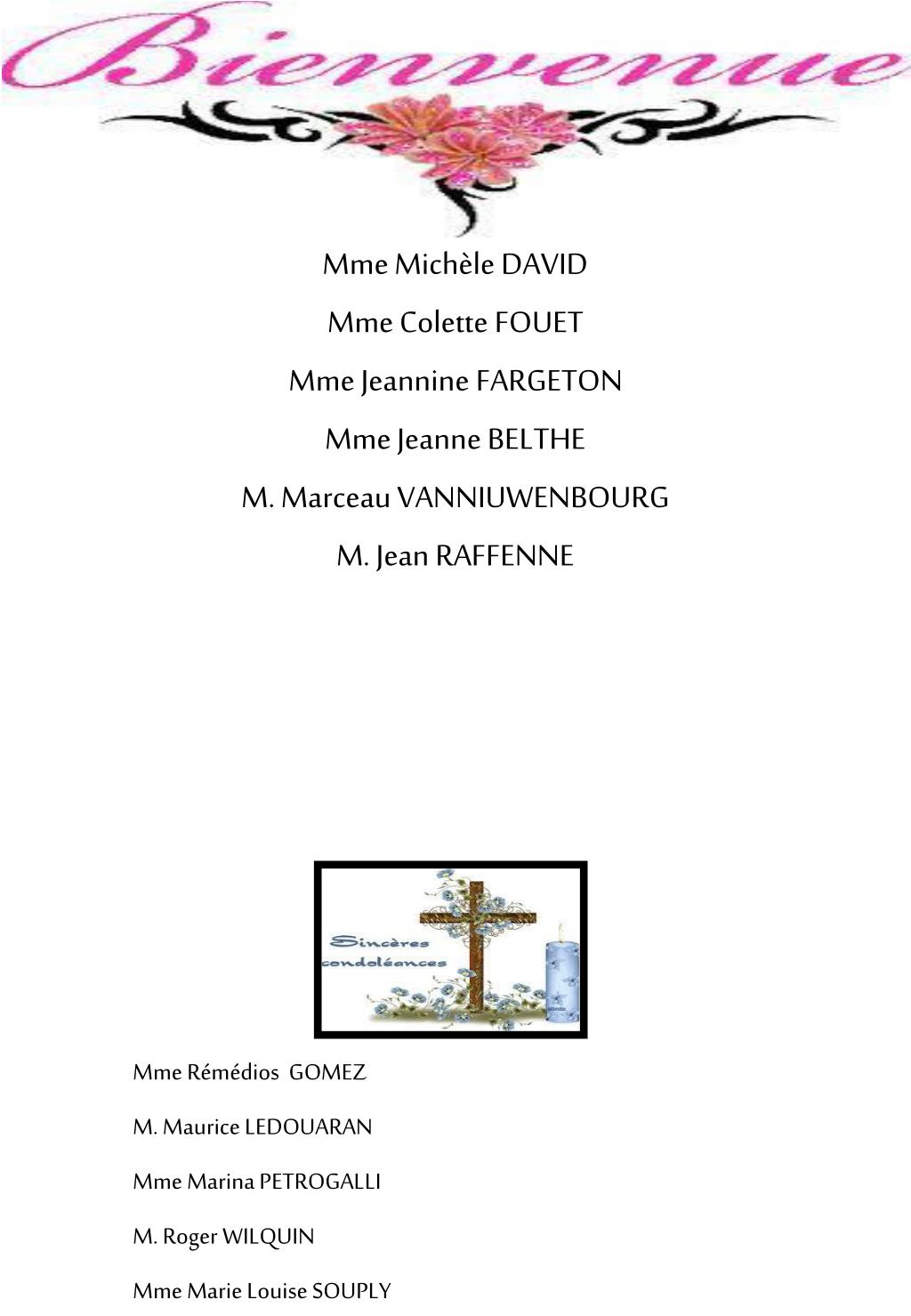 Mme Rémédios GOMEZ M. Maurice LEDOUARAN Mme Marina PETROGALLI M. Roger WILQUIN Mme Marie Louise SOUPLY Mme Michèle DAVID Mme Colette FOUET Mme Jeannine FARGETON Mme Jeanne BELTHE M. Marceau VANNIUWENBOURG M. Jean RAFFENNE