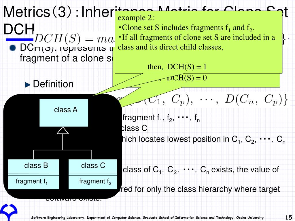 example 2: ・Clone set S includes fragments f1 and f2. ・If all fragments of clone set S are included in a class and its direct child classes, then,DCH(S) = 1 example 1: ・Clone set S includes fragments f1 and f2. ・If all fragments of clone set S are included in a same class, then, DCH(S) = 0 class A class C class B fragment f1 fragment f2 class A fragment f1 fragment f2 Metrics(3):Inheritance Metric for Clone SetDCH • DCH(S): represents the position and distance between each fragment of a clone set S • Definition • Clone set S includes fragment f1, f2, ・・・,fn • Fragment fi exists in class Ci • Class Cp is a class which locates lowest position in C1, C2, ・・・,Cn on class hierarchy • If no common parent class of C1,C2,・・・,Cn exists, the value of DCH(S) is -1 • This metric is measured for only the class hierarchy where target software exists.
