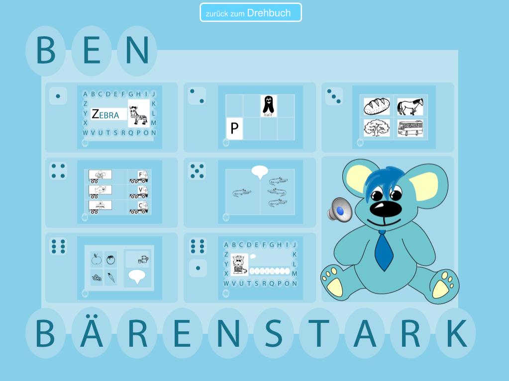 Drehbuch Ben Bärenstark iPadApp. Autor: Dominic Rey Version: 1.0 Datum: 11. Mai 2013. Lernziele. Lernziele der iPadApp das Erlernen des Alphabets, besonders die Verbindung von Phonem und Graphem Anlaute erkennen und zuordnen können Pluralbildung verstehen und erkennen können