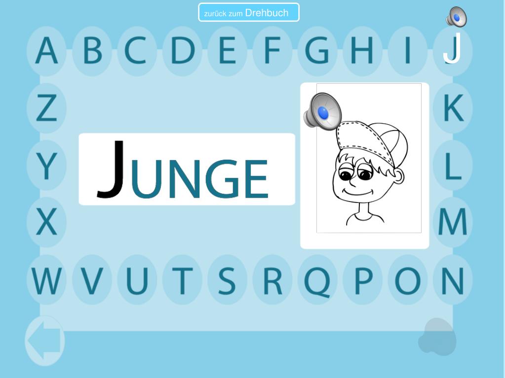Lernziele • Lernziele der iPadApp • das Erlernen des Alphabets, besonders die Verbindung von Phonem und Graphem • Anlaute erkennen und zuordnen können • Pluralbildung verstehen und erkennen können • Buchstaben zu Wörter zusammensetzen können • Wörter zu neuen Wörtern zusammensetzen können • kurze Wörter erlesen können
