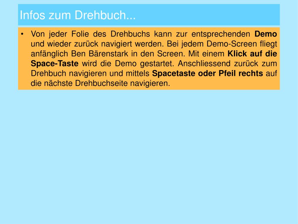 Infos zum Drehbuch... • Von jeder Folie des Drehbuchs kann zur entsprechenden Demo und wieder zurück navigiert werden. Bei jedem Demo-Screen fliegt anfänglich Ben Bärenstark in den Screen. Mit einem Klick auf die Space-Taste wird die Demo gestartet. Anschliessend zurück zum Drehbuch navigieren und mittels Spacetaste oder Pfeil rechts auf die nächste Drehbuchseite navigieren.