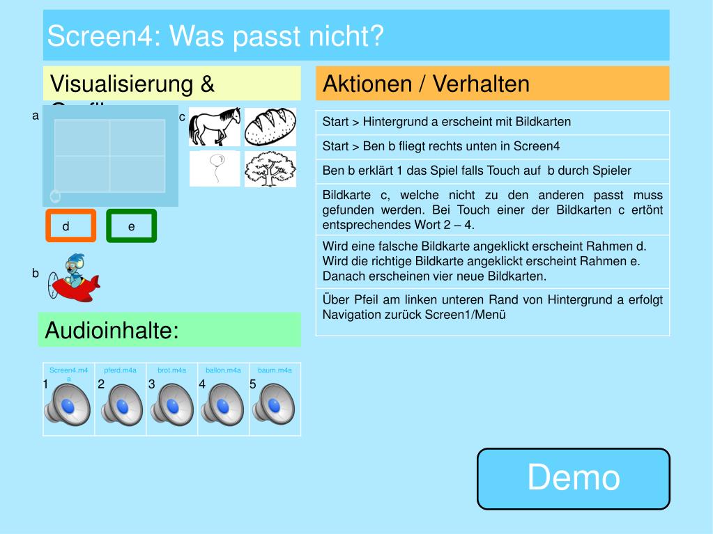 Screen4: Was passt nicht? Visualisierung& Grafiken: Aktionen / Verhalten a c d e b Audioinhalte: 1 2 3 4 5 Demo