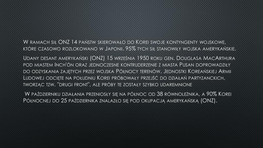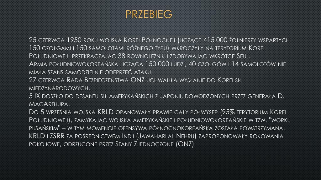 przebieg 25 czerwca 1950 roku wojska Korei Północnej (liczące 415 000 żołnierzy wspartych 150 czołgami i 150 samolotami różnego typu) wkroczyły na terytorium Korei Południowej przekraczając 38 równoleżnik i zdobywając wkrótce Seul.Armia południowokoreańska licząca 150 000 ludzi, 40 czołgów i 14 samolotów nie miała szans samodzielnie odeprzeć ataku.27 czerwca Rada Bezpieczeństwa ONZ uchwaliła wysłanie do Korei sił międzynarodowych.5 IX doszło do desantu sił amerykańskich z Japonii, dowodzonych przez generała D. MacArthura. Do 5 września wojska KRLD opanowały prawie cały półwysep (95% terytorium Korei Południowej), zamykając wojska amerykańskie i południowokoreańskie w tzw. "worku pusańskim" – w tym momencie ofensywa północnokoreańska została powstrzymana. KRLD i ZSRR za pośrednictwem Indii (Jawaharlal Nehru) zaproponowały rokowania pokojowe, odrzucone przez Stany Zjednoczone (ONZ)