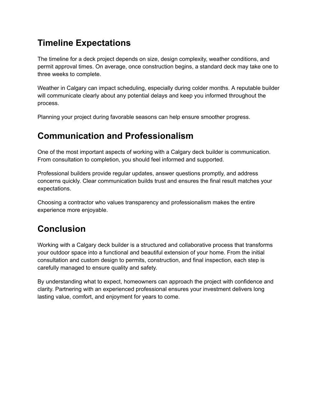 Timeline Expectations The timeline for a deck project depends on size, design complexity, weather conditions, and permit approval times. On average, once construction begins, a standard deck may take one to three weeks to complete. Weather in Calgary can impact scheduling, especially during colder months. A reputable builder will communicate clearly about any potential delays and keep you informed throughout the process. Planning your project during favorable seasons can help ensure smoother progress. Communication and Professionalism One of the most important aspects of working with a Calgary deck builder is communication. From consultation to completion, you should feel informed and supported. Professional builders provide regular updates, answer questions promptly, and address concerns quickly. Clear communication builds trust and ensures the final result matches your expectations. Choosing a contractor who values transparency and professionalism makes the entire experience more enjoyable. Conclusion Working with a Calgary deck builder is a structured and collaborative process that transforms your outdoor space into a functional and beautiful extension of your home. From the initial consultation and custom design to permits, construction, and final inspection, each step is carefully managed to ensure quality and safety. By understanding what to expect, homeowners can approach the project with confidence and clarity. Partnering with an experienced professional ensures your investment delivers long lasting value, comfort, and enjoyment for years to come.