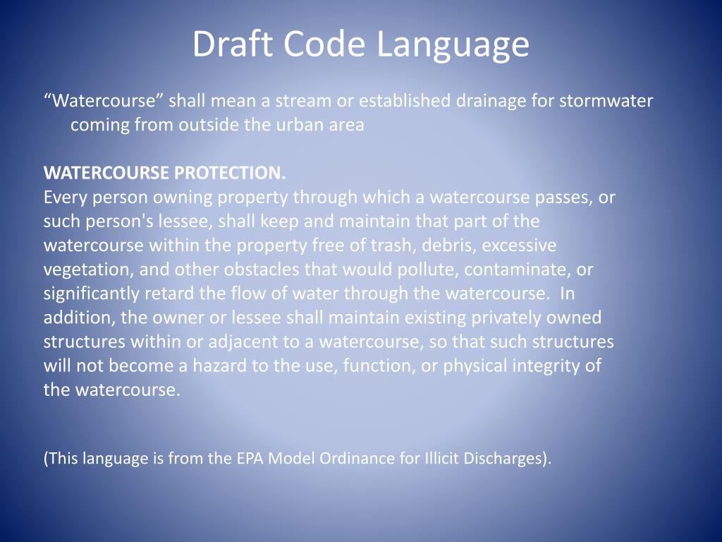 Draft Code Language “Watercourse” shall mean a stream or established drainage for stormwater coming from outside the urban area WATERCOURSE PROTECTION. Every person owning property through which a watercourse passes, or such person's lessee, shall keep and maintain that part of the watercourse within the property free of trash, debris, excessive vegetation, and other obstacles that would pollute, contaminate, or significantly retard the flow of water through the watercourse. In addition, the owner or lessee shall maintain existing privately owned structures within or adjacent to a watercourse, so that such structures will not become a hazard to the use, function, or physical integrity of the watercourse. (This language is from the EPA Model Ordinance for Illicit Discharges).
