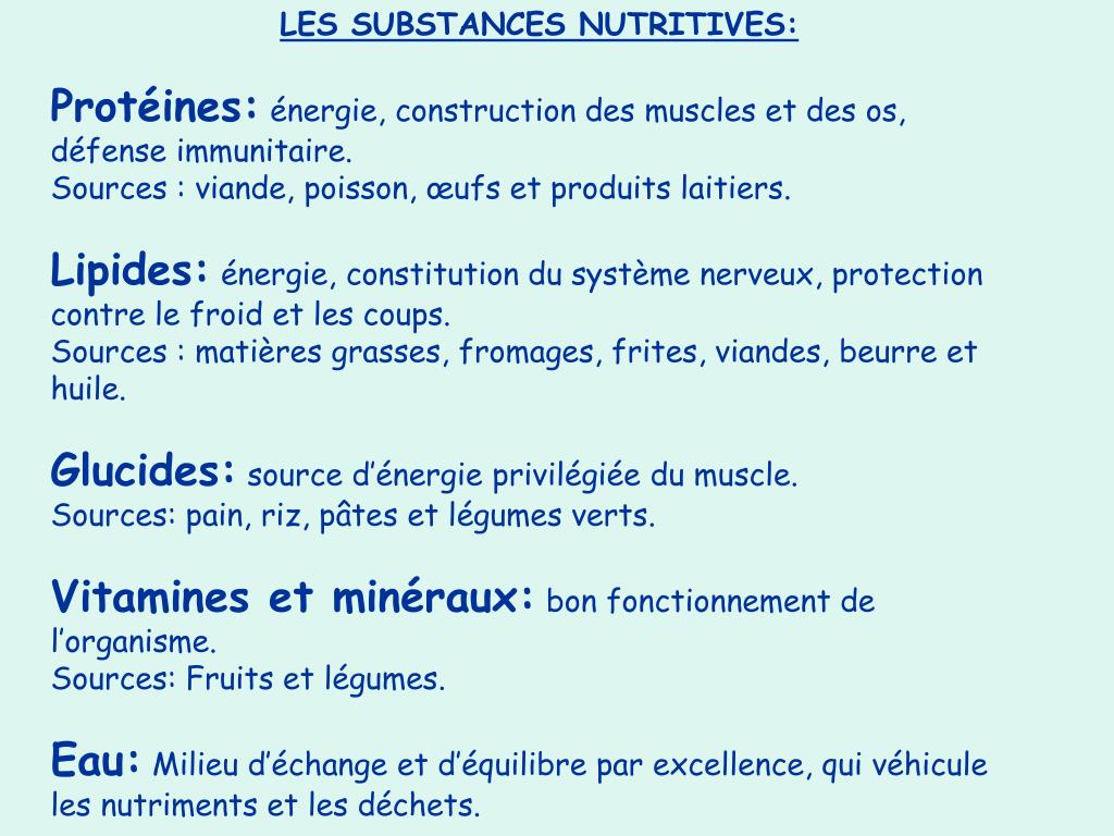 LES SUBSTANCES NUTRITIVES: Protéines: énergie, construction des muscles et des os, défense immunitaire. Sources : viande, poisson, œufs et produits laitiers. Lipides: énergie, constitution du système nerveux, protection contre le froid et les coups. Sources : matières grasses, fromages, frites, viandes, beurre et huile. Glucides: source d’énergie privilégiée du muscle. Sources: pain, riz, pâtes et légumes verts. Vitamines et minéraux: bon fonctionnement de l’organisme. Sources: Fruits et légumes. Eau: Milieu d’échange et d’équilibre par excellence, qui véhicule les nutriments et les déchets.