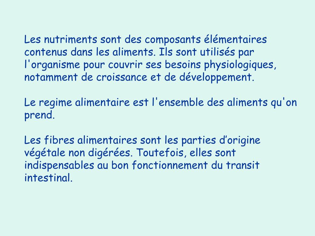 Les nutriments sont des composants élémentaires contenus dans les aliments. Ils sont utilisés par l'organisme pour couvrir ses besoins physiologiques, notamment de croissance et de développement. Le regime alimentaire est l'ensemble des aliments qu'on prend. Les fibres alimentaires sont les parties d’origine végétale non digérées. Toutefois, elles sont indispensables au bon fonctionnement du transit intestinal.