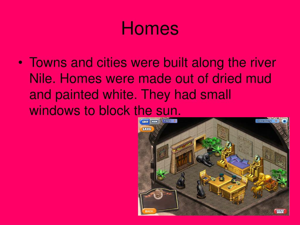 Homes • Towns and cities were built along the river Nile. Homes were made out of dried mud and painted white. They had small windows to block the sun.