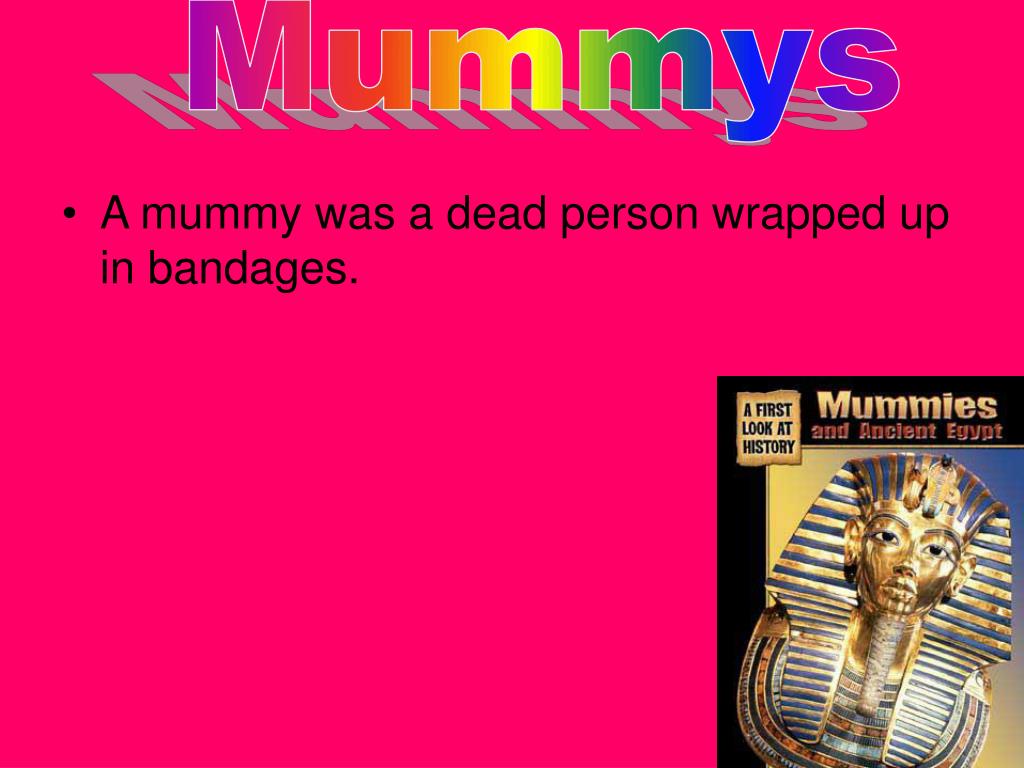 Mummys • A mummy was a dead person wrapped up in bandages.