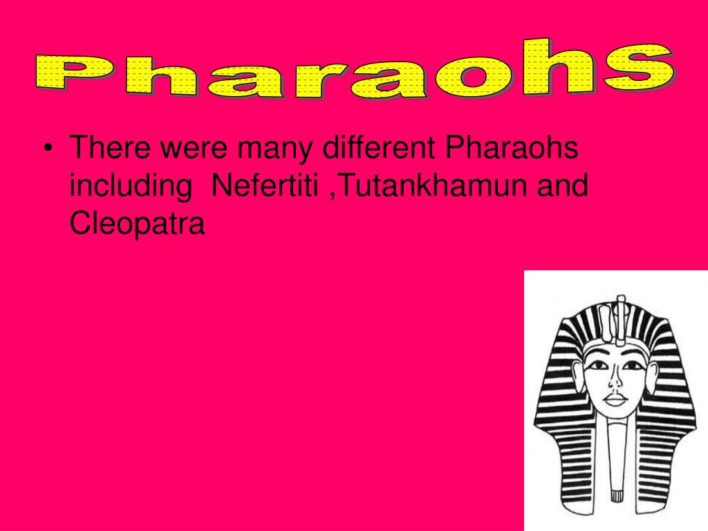 Pharaohs • There were many different Pharaohs including Nefertiti ,Tutankhamun and Cleopatra
