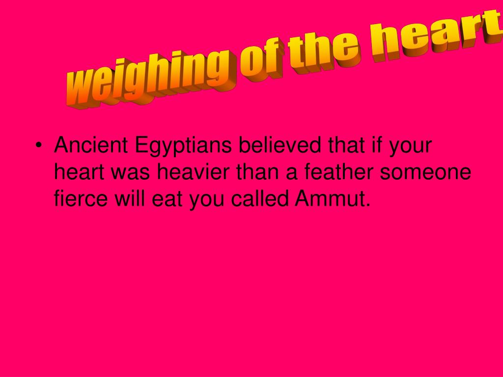 weighing of the heart • Ancient Egyptians believed that if your heart was heavier than a feather someone fierce will eat you called Ammut.