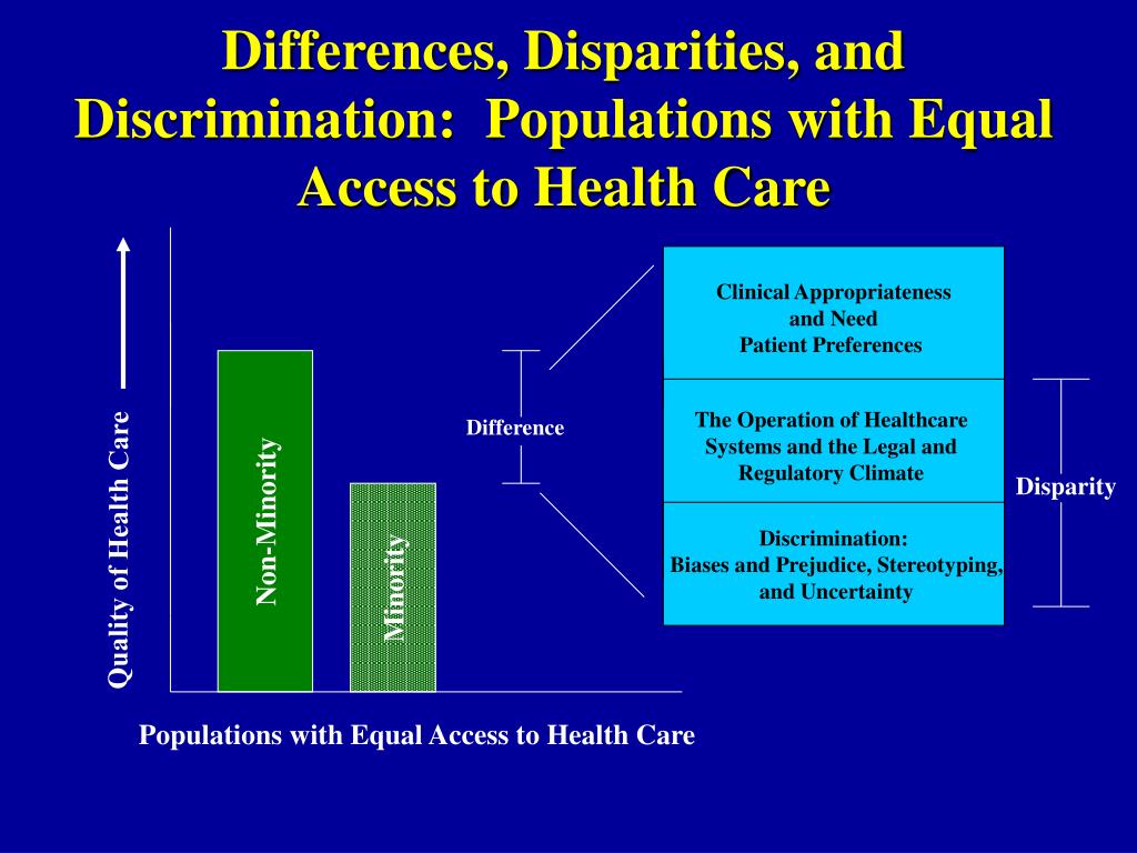 Differences, Disparities, and Discrimination: Populations with Equal Access to Health Care Clinical Appropriateness and Need Patient Preferences Non-Minority The Operation of Healthcare Systems and the Legal and Regulatory Climate Difference Quality of Health Care Disparity Minority Discrimination: Biases and Prejudice, Stereotyping, and Uncertainty Populations with Equal Access to Health Care