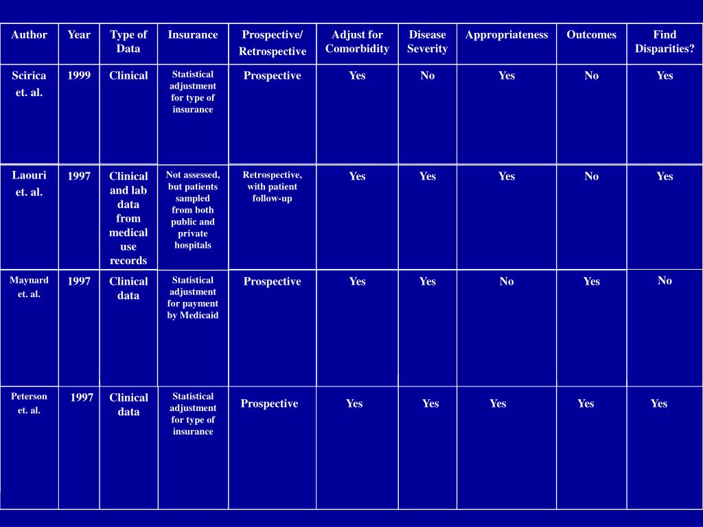 Author Year Type of Data Insurance Prospective/ Retrospective Adjust for Comorbidity Disease Severity Appropriateness Outcomes Find Disparities? Scirica et. al. 1999 Clinical Statistical adjustment for type of insurance Prospective Yes No Yes No Yes Laouri et. al. 1997 Clinical and lab data from medical use records Not assessed, but patients sampled from both public and private hospitals Retrospective, with patient follow-up Yes Yes Yes No Yes No Maynard et. al. 1997 Clinical data Statistical adjustment for payment by Medicaid Prospective Yes Yes No Yes Peterson et. al. 1997 Clinical data Statistical adjustment for type of insurance Prospective Yes Yes Yes Yes Yes