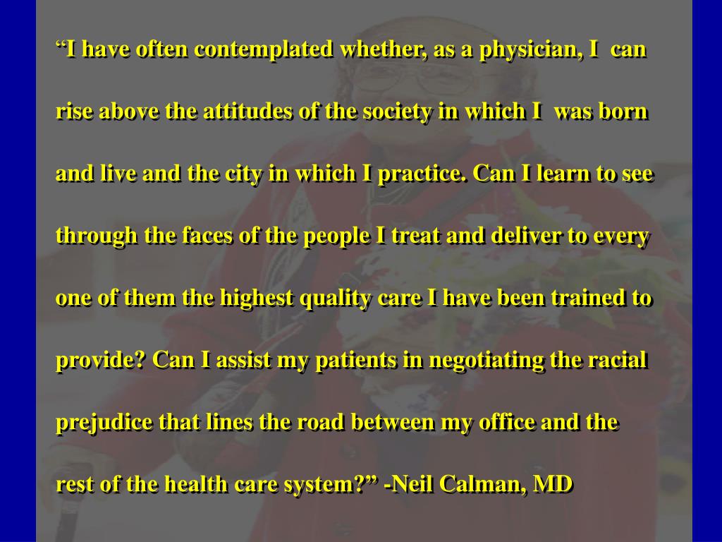 “I have often contemplated whether, as a physician, I can rise above the attitudes of the society in which I was born and live and the city in which I practice. Can I learn to see through the faces of the people I treat and deliver to every one of them the highest quality care I have been trained to provide? Can I assist my patients in negotiating the racial prejudice that lines the road between my office and the rest of the health care system?” -Neil Calman, MD
