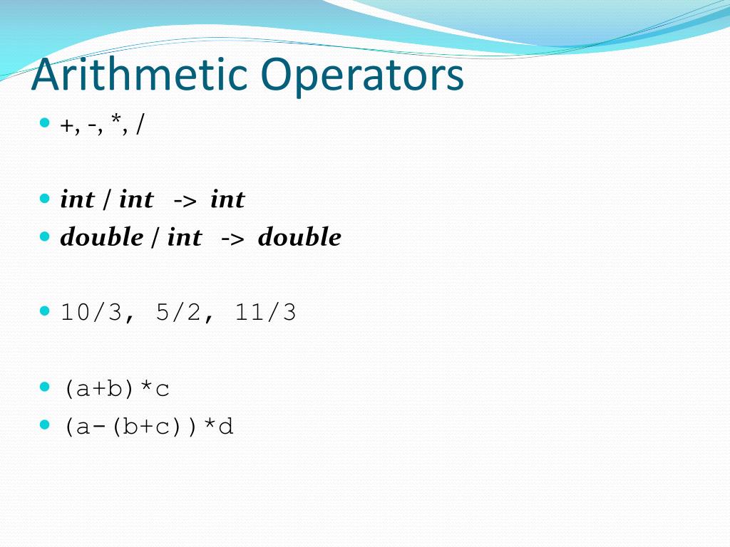 Arithmetic Operators • +, -, *, / • int / int -> int • double / int-> double • 10/3, 5/2, 11/3 • (a+b)*c • (a-(b+c))*d