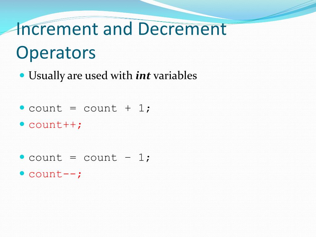 Increment and Decrement Operators • Usually are used with int variables • count = count + 1; • count++; • count = count – 1; • count--;