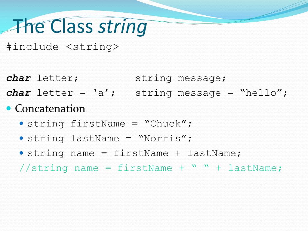 The Class string #include <string> charletter; string message; charletter = ‘a’; string message = “hello”; • Concatenation • string firstName = “Chuck”; • string lastName = “Norris”; • string name = firstName + lastName; //string name = firstName + “ “ + lastName;