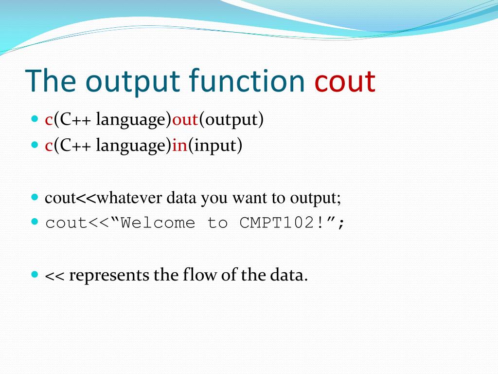The output function cout • c(C++ language)out(output) • c(C++ language)in(input) • cout<<whatever data you want to output; • cout<<“Welcome to CMPT102!”; • << represents the flow of the data.
