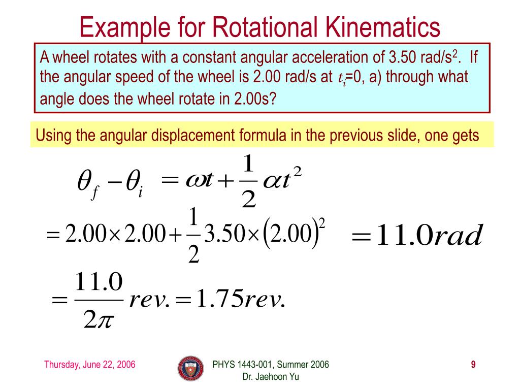 Example for Rotational Kinematics A wheel rotates with a constant angular acceleration of 3.50 rad/s2. If the angular speed of the wheel is 2.00 rad/s at ti=0, a) through what angle does the wheel rotate in 2.00s? Using the angular displacement formula in the previous slide, one gets PHYS 1443-001, Summer 2006 Dr. Jaehoon Yu