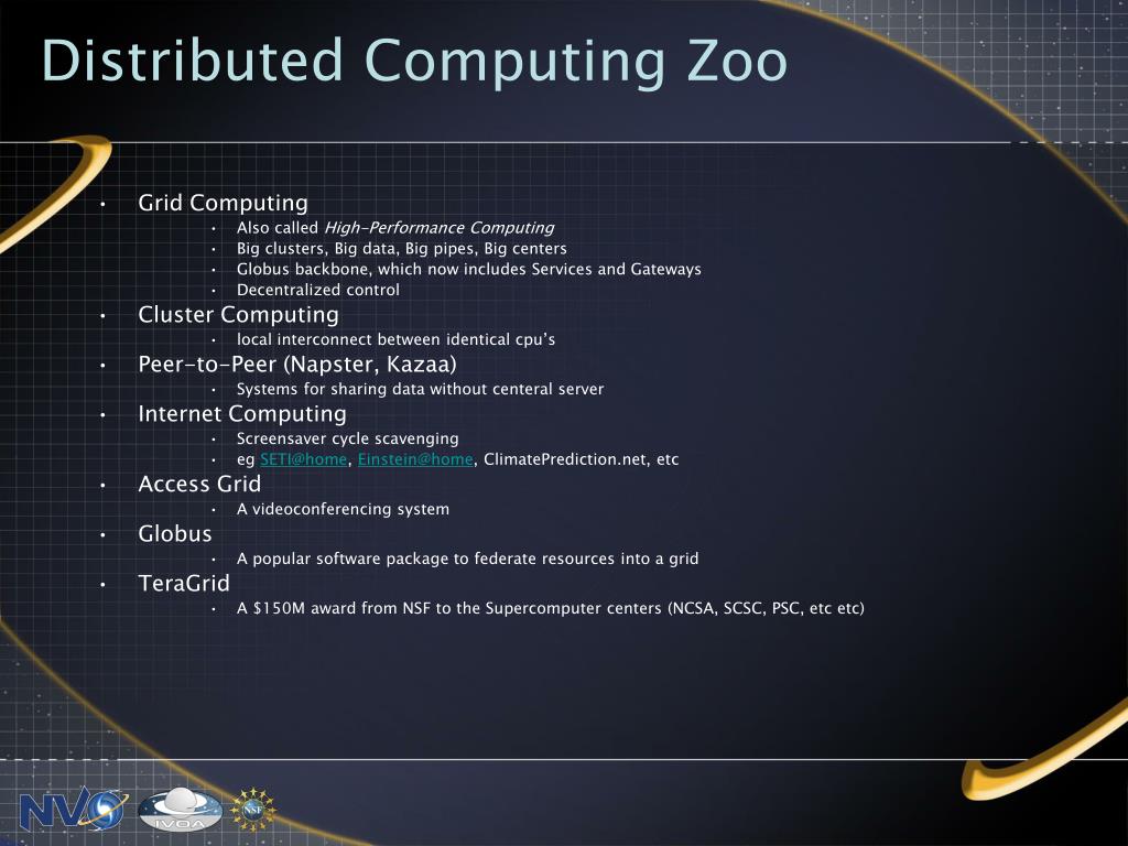 Distributed Computing Zoo • Grid Computing • Also called High-Performance Computing • Big clusters, Big data, Big pipes, Big centers • Globus backbone, which now includes Services and Gateways • Decentralized control • Cluster Computing • local interconnect between identical cpu’s • Peer-to-Peer (Napster, Kazaa) • Systems for sharing data without centeral server • Internet Computing • Screensaver cycle scavenging • eg SETI@home, Einstein@home, ClimatePrediction.net, etc • Access Grid • A videoconferencing system • Globus • A popular software package to federate resources into a grid • TeraGrid • A $150M award from NSF to the Supercomputer centers (NCSA, SCSC, PSC, etc etc)