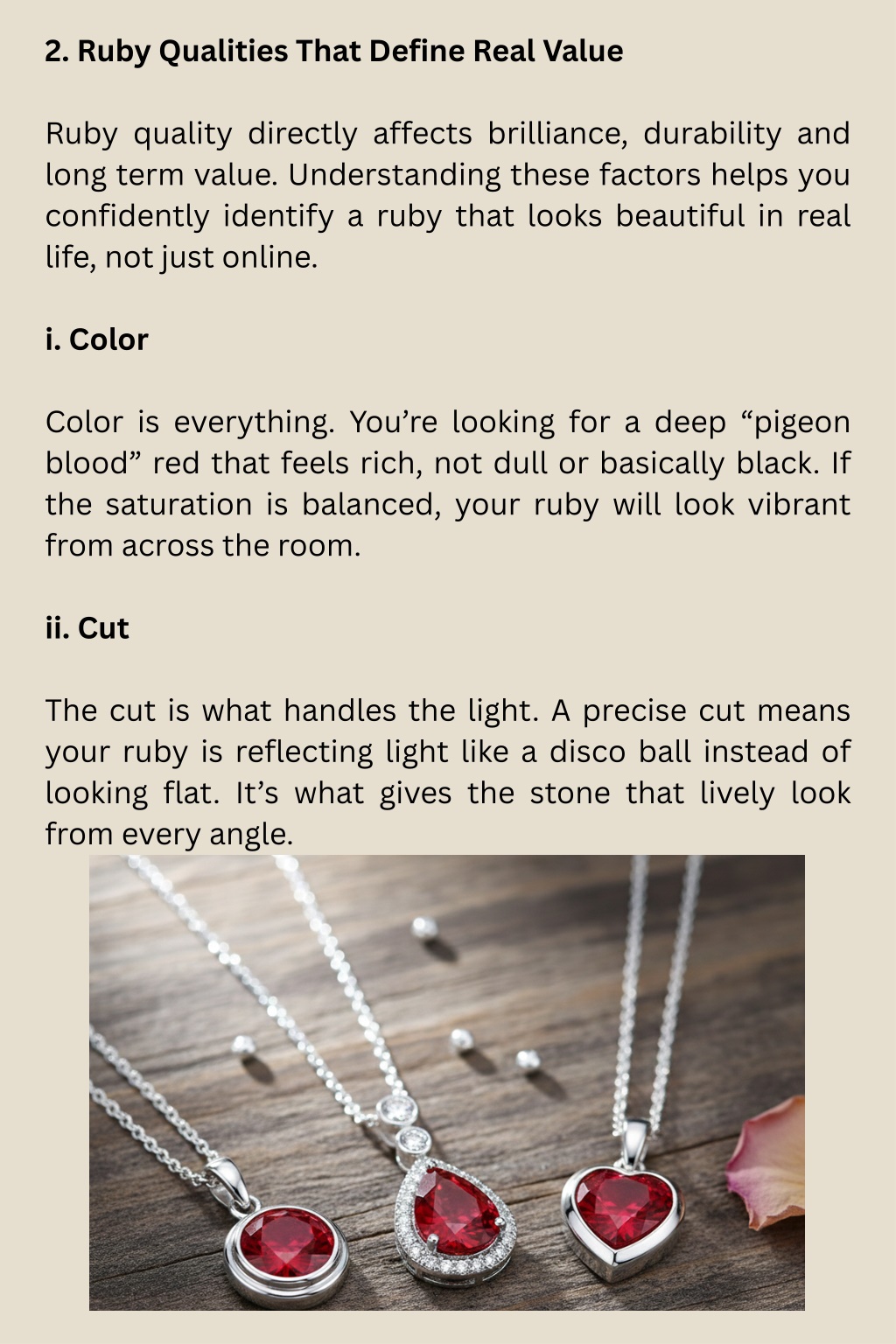 2. Ruby Qualities That Define Real Value Ruby quality directly affects brilliance, durability and long term value. Understanding these factors helps you confidently identify a ruby that looks beautiful in real life, not just online. i. Color Color is everything. You’re looking for a deep “pigeon blood” red that feels rich, not dull or basically black. If the saturation is balanced, your ruby will look vibrant from across the room. ii. Cut The cut is what handles the light. A precise cut means your ruby is reflecting light like a disco ball instead of looking flat. It’s what gives the stone that lively look from every angle.