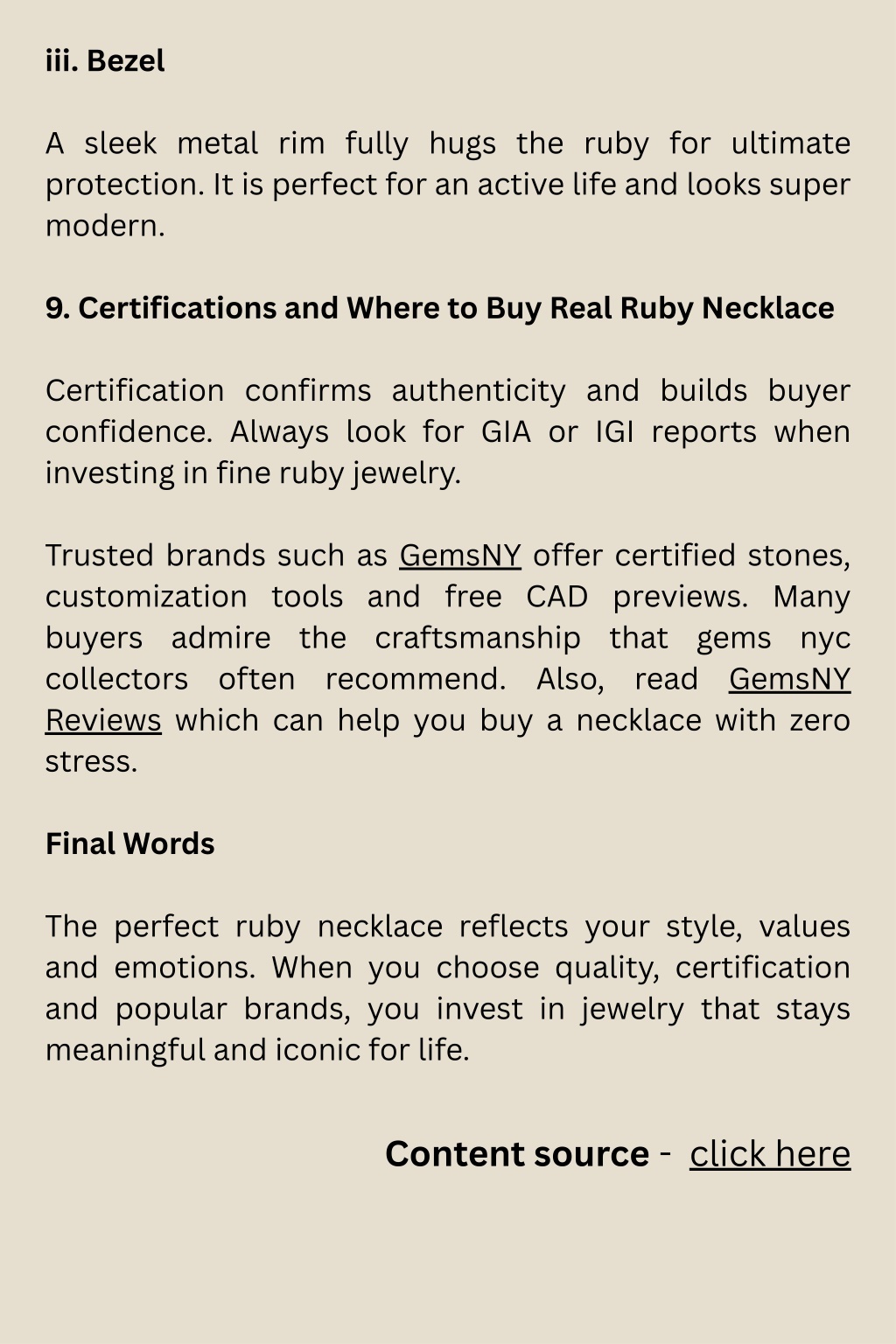 iii. Bezel A sleek metal rim fully hugs the ruby for ultimate protection. It is perfect for an active life and looks super modern. 9. Certifications and Where to Buy Real Ruby Necklace Certification confirms authenticity and builds buyer confidence. Always look for GIA or IGI reports when investing in fine ruby jewelry. Trusted brands such as GemsNY offer certified stones, customization tools and free CAD previews. Many buyers admire the craftsmanship that gems nyc collectors often recommend. Also, read GemsNY Reviews which can help you buy a necklace with zero stress. Final Words The perfect ruby necklace reflects your style, values and emotions. When you choose quality, certification and popular brands, you invest in jewelry that stays meaningful and iconic for life. Content source - click here