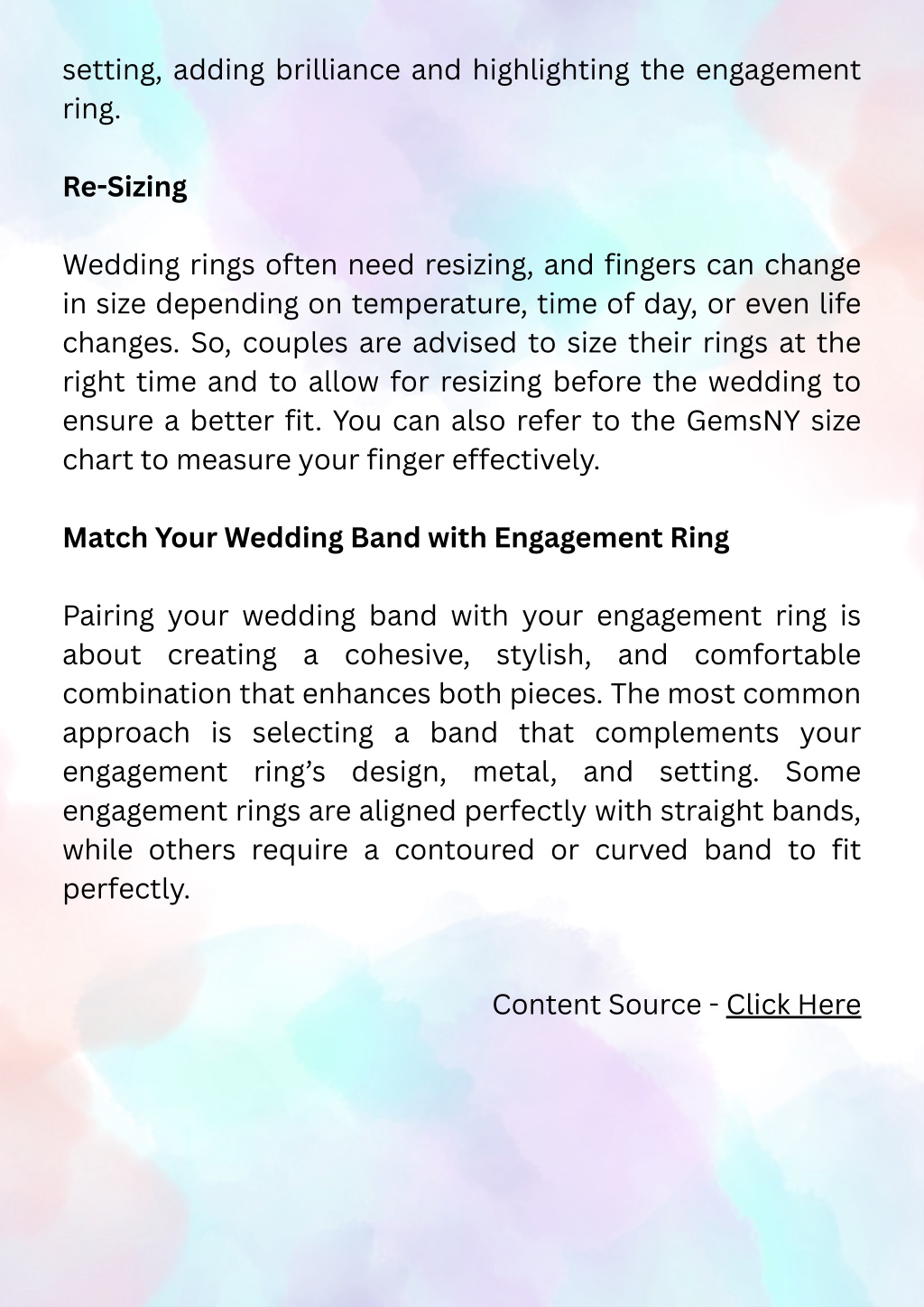 setting, adding brilliance and highlighting the engagement ring. Re-Sizing Wedding rings often need resizing, and fingers can change in size depending on temperature, time of day, or even life changes. So, couples are advised to size their rings at the right time and to allow for resizing before the wedding to ensure a better fit. You can also refer to the GemsNY size chart to measure your finger effectively. Match Your Wedding Band with Engagement Ring Pairing your wedding band with your engagement ring is about creating a cohesive, stylish, and comfortable combination that enhances both pieces. The most common approach is selecting a band that complements your engagement ring’s design, metal, and setting. Some engagement rings are aligned perfectly with straight bands, while others require a contoured or curved band to fit perfectly. Content Source - Click Here