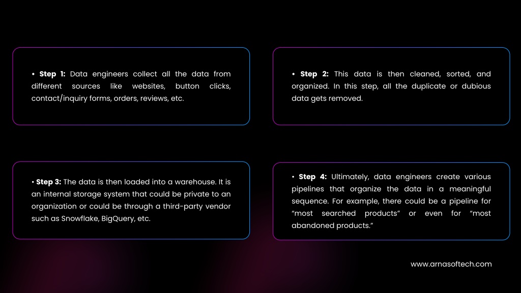• Step 1: Data engineers collect all the data from different sources like contact/inquiry forms, orders, reviews, etc. • Step 2: This data is then cleaned, sorted, and organized. In this step, all the duplicate or dubious data gets removed. websites, button clicks, • Step 4: Ultimately, data engineers create various pipelines that organize the data in a meaningful sequence. For example, there could be a pipeline for “most searched products” abandoned products.” • Step 3: The data is then loaded into a warehouse. It is an internal storage system that could be private to an organization or could be through a third-party vendor such as Snowflake, BigQuery, etc. or even for “most www.arnasoftech.com