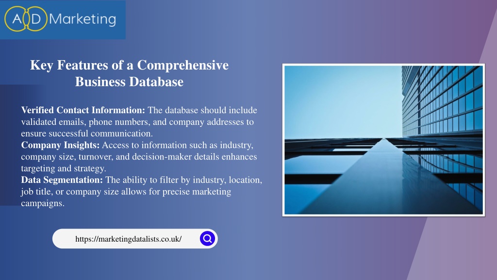A business database UK - Ad Marketing offers a comprehensive collection of verified company information, enabling businesses to connect with decision-makers, generate high-quality leads, and develop targeted marketing campaigns. Whether you are a start-up seeking new opportunities or an established company looking to expand, access to a detailed and accurate business database ensures that your outreach efforts are precise and impactful. With the right data at your fingertips, you can focus on what matters most – building relationships, enhancing sales, and driving revenue growth. https://marketingdatalists.co.uk/