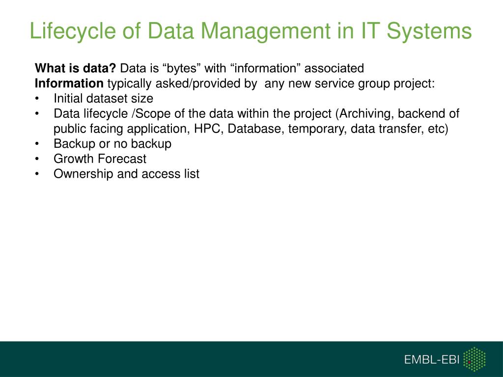 Lifecycle of Data Management in IT Systems • What is data? Data is “bytes” with “information” associated • Informationtypically asked/provided by any new service group project: • Initial dataset size • Data lifecycle /Scope of the data within the project (Archiving, backend of public facing application, HPC, Database, temporary, data transfer, etc) • Backup or no backup • Growth Forecast • Ownership and access list
