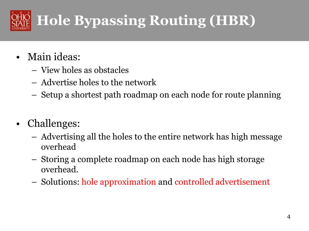 Hole Bypassing Routing (HBR) • Main ideas: • View holes as obstacles • Advertise holes to the network • Setup a shortest path roadmap on each node for route planning • Challenges: • Advertising all the holes to the entire network has high message overhead • Storing a complete roadmap on each node has high storage overhead. • Solutions: hole approximation and controlled advertisement
