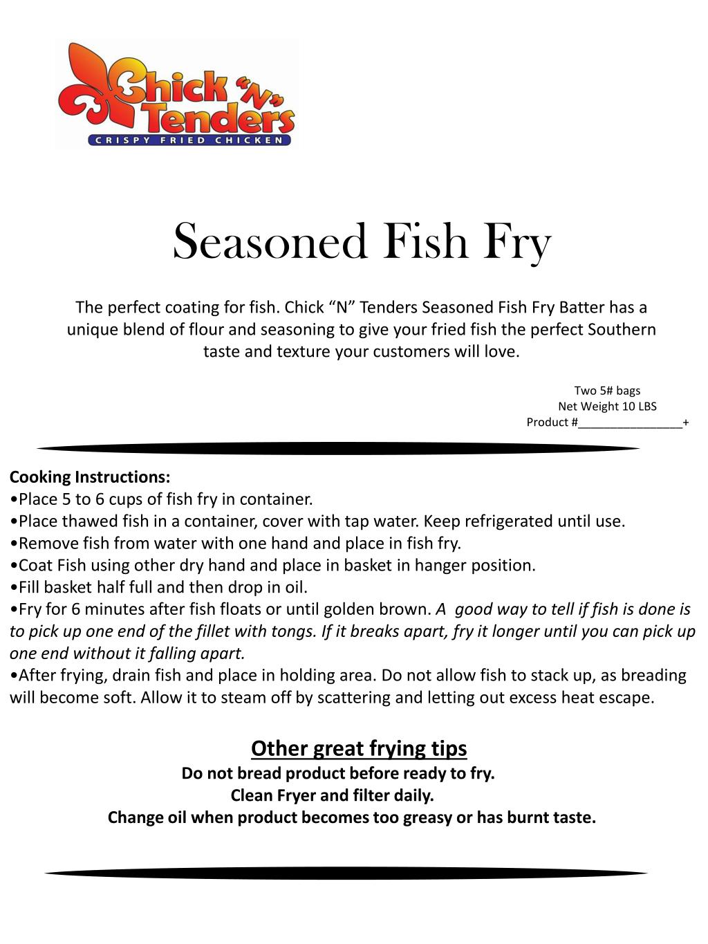 Seasoned Fish Fry The perfect coating for fish. Chick “N” Tenders Seasoned Fish Fry Batter has a unique blend of flour and seasoning to give your fried fish the perfect Southern taste and texture your customers will love. Two 5# bags Net Weight 10 LBS Product #________________+ • Cooking Instructions: • Place 5 to 6 cups of fish fry in container. • Place thawed fish in a container, cover with tap water. Keep refrigerated until use. • Remove fish from water with one hand and place in fish fry. • Coat Fish using other dry hand and place in basket in hanger position. • Fill basket half full and then drop in oil. • Fry for 6 minutes after fish floats or until golden brown. A good way to tell if fish is done is to pick up one end of the fillet with tongs. If it breaks apart, fry it longer until you can pick up one end without it falling apart. • After frying, drain fish and place in holding area. Do not allow fish to stack up, as breading will become soft. Allow it to steam off by scattering and letting out excess heat escape. Other great frying tips Do not bread product before ready to fry. Clean Fryer and filter daily. Change oil when product becomes too greasy or has burnt taste.