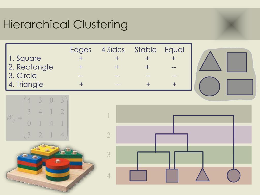 Hierarchical Clustering Edges 4 Sides Stable Equal 1. Square + + + + 2. Rectangle + + + -- 3. Circle -- -- -- -- 4. Triangle + -- + +