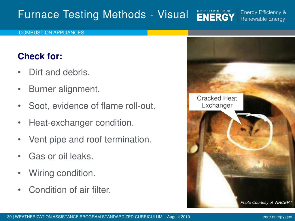 Furnace Testing Methods - Visual Combustion appliances Check for: • Dirt and debris. • Burner alignment. • Soot, evidence of flame roll-out. • Heat-exchanger condition. • Vent pipe and roof termination. • Gas or oil leaks. • Wiring condition. • Condition of air filter. Cracked Heat Exchanger Photo Courtesy of NRCERT